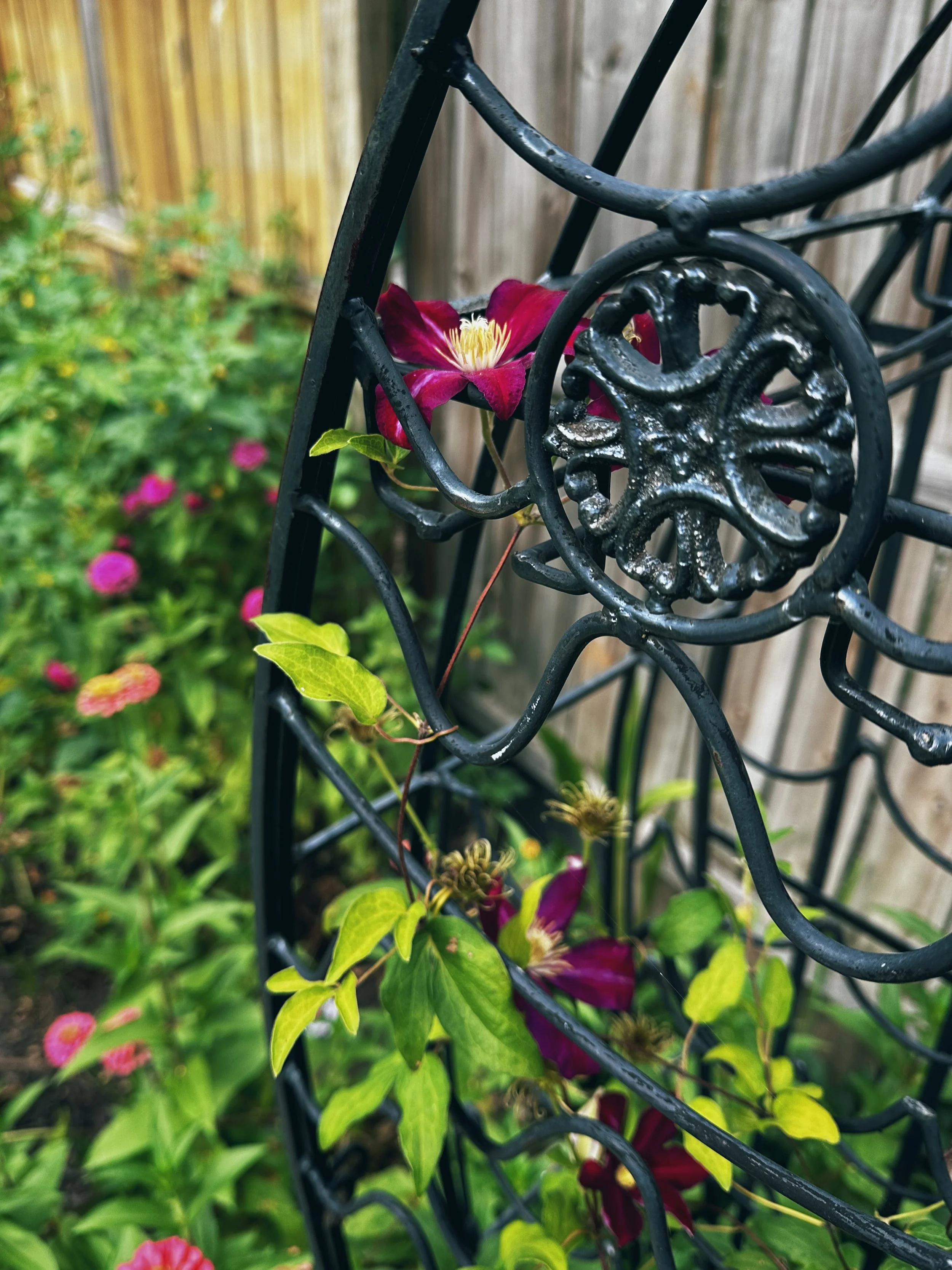 Sometimes someone leaves a fish-shaped wine rack in your yard and you have to grow clematis on it.